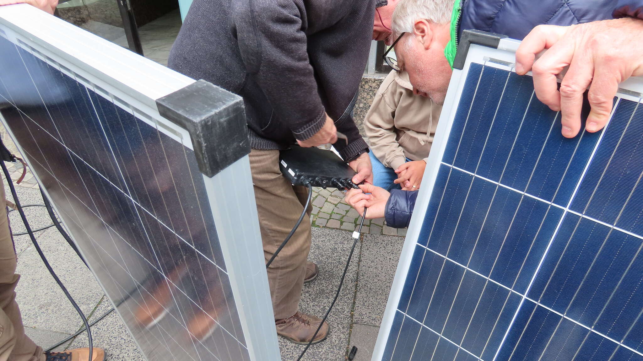 Anschließend geht’s ganz praktisch weiter: Solarmodul, Wechselrichter, Verkabelung, Steckverbindungen usw. können angefasst und selbst zusammengebaut werden.