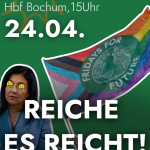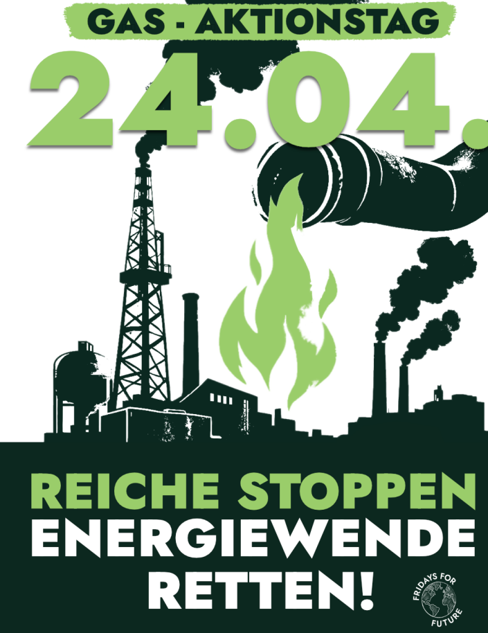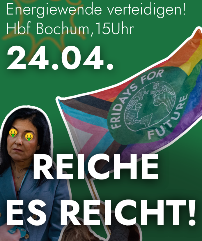 Am 24. April um 15Uhr am Bochumer Hbf geht Fridays for Future wieder auf die Straße zum bundesweiten Gas-Aktionstag und wir protestieren gegen Katherina Reiche und co. In der aktuellen fossilen Krise wird die Energiewende mit dem Gebäudemodernisierungsgesetz, der EEG-Reform und weiteren Maßnahmen torpediert, während Fracking, LNG-Terminals, Gaskraftwerke und Gasförderungen ausgebaut werden sollen. Das trifft uns alle hart und wird die Lebenskosten weiter in die Höhe treiben, deshalb appelieren wir and die Bundesregierung, vor allem an die SPD, diese Pläne zu stoppen und eine beschleunigte Energie- und Wärmewende umzusetzen.